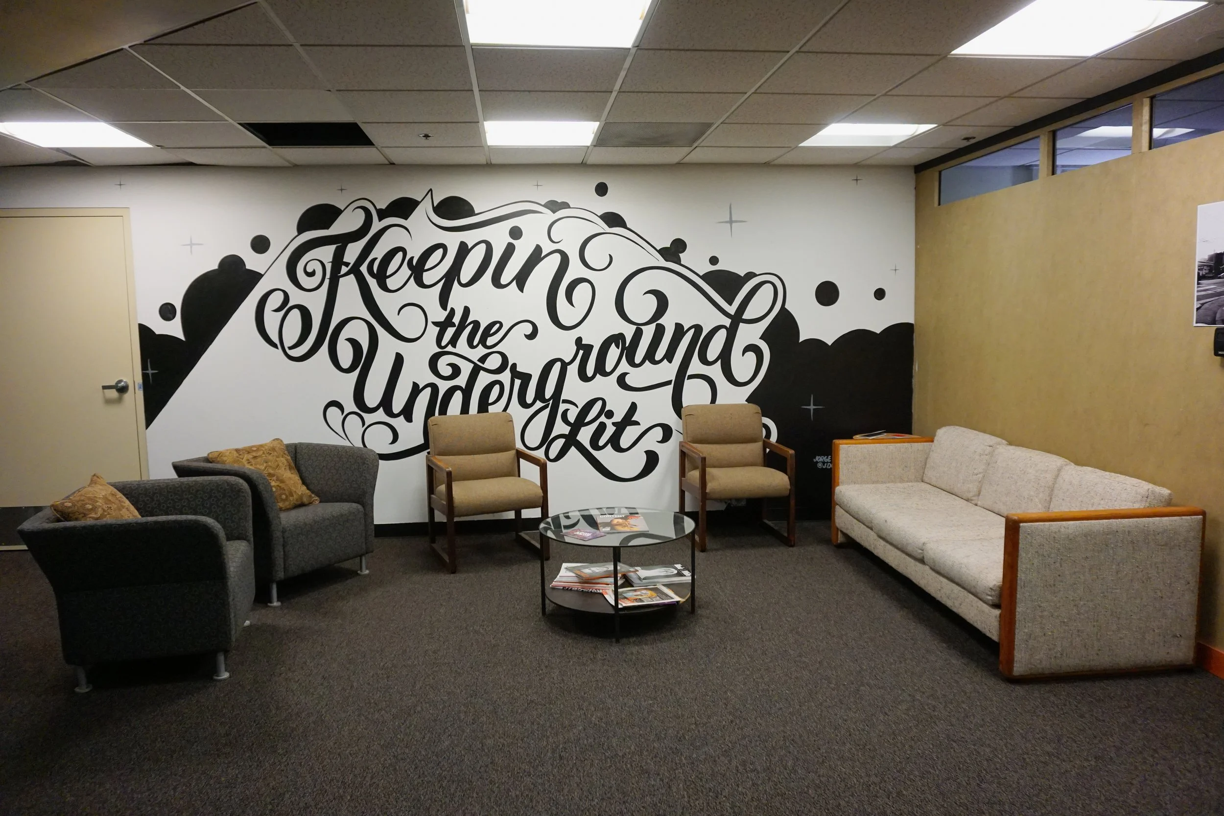 Our light industrial studio offers space for large-scale projects and elaborate production lines, including screen printers, muralists, sign painters, and designers.